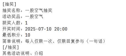 - 抽奖帖需写明:抽奖名称、活动奖品、获奖人数、开奖时间、简单说明