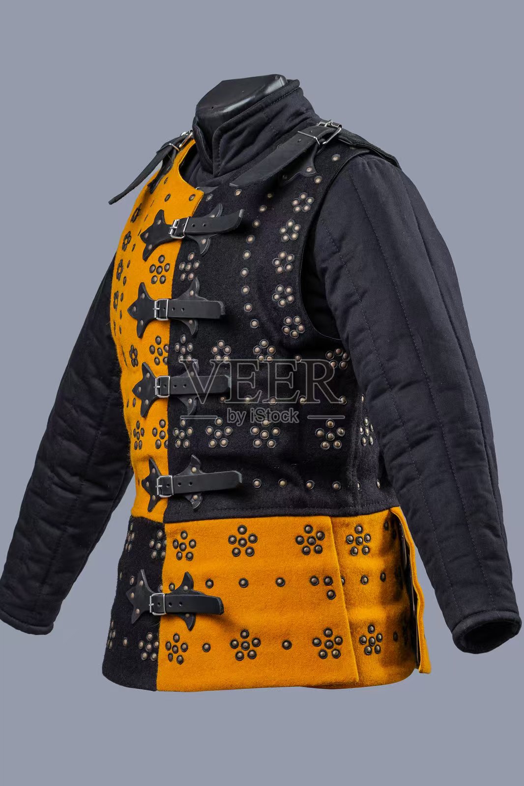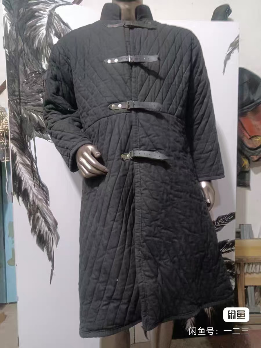 3.软甲,武装衣。下图展示为武装衣(注:武装衣与亚麻软甲为两种不同的护具,武装衣为填充软袍,类似羽绒服,上缝有盔甲部件挂点,不直接与敌人的兵刃接触,主要起缓冲作用。亚麻软甲由多层亚麻叠加缝合而成,质地较为坚硬,类似老布鞋的千层底,多由民兵穿着,与敌人的兵刃直接接触,起到一定的保护作用。)